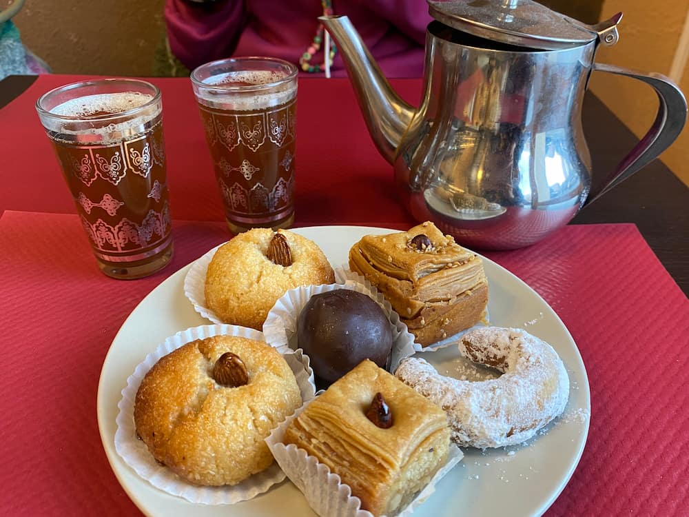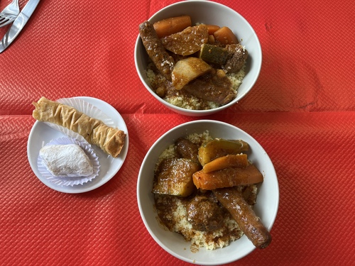 Couscous à partir de 11,8€ ; Tajines à 13,8€ ; Pâtisseries aux amandes à partir de 1,95€.